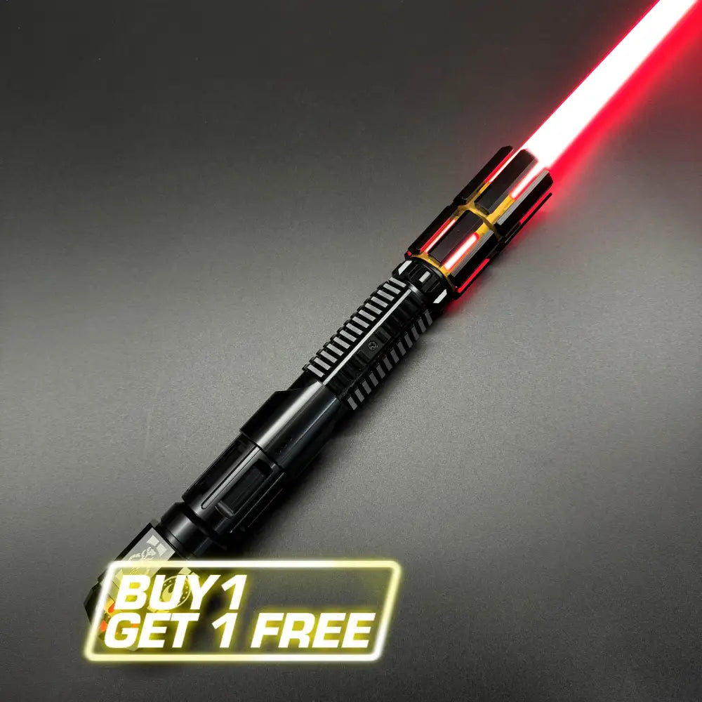 A striking and sophisticated Saber, featuring a brilliant blade and golden details reminiscent of a regal crown. The black hilt, enhanced with technological elements and grooves, ensures a secure and elegant grip. Perfect for masters of the Force seeking a weapon with powerful and unmistakable style.