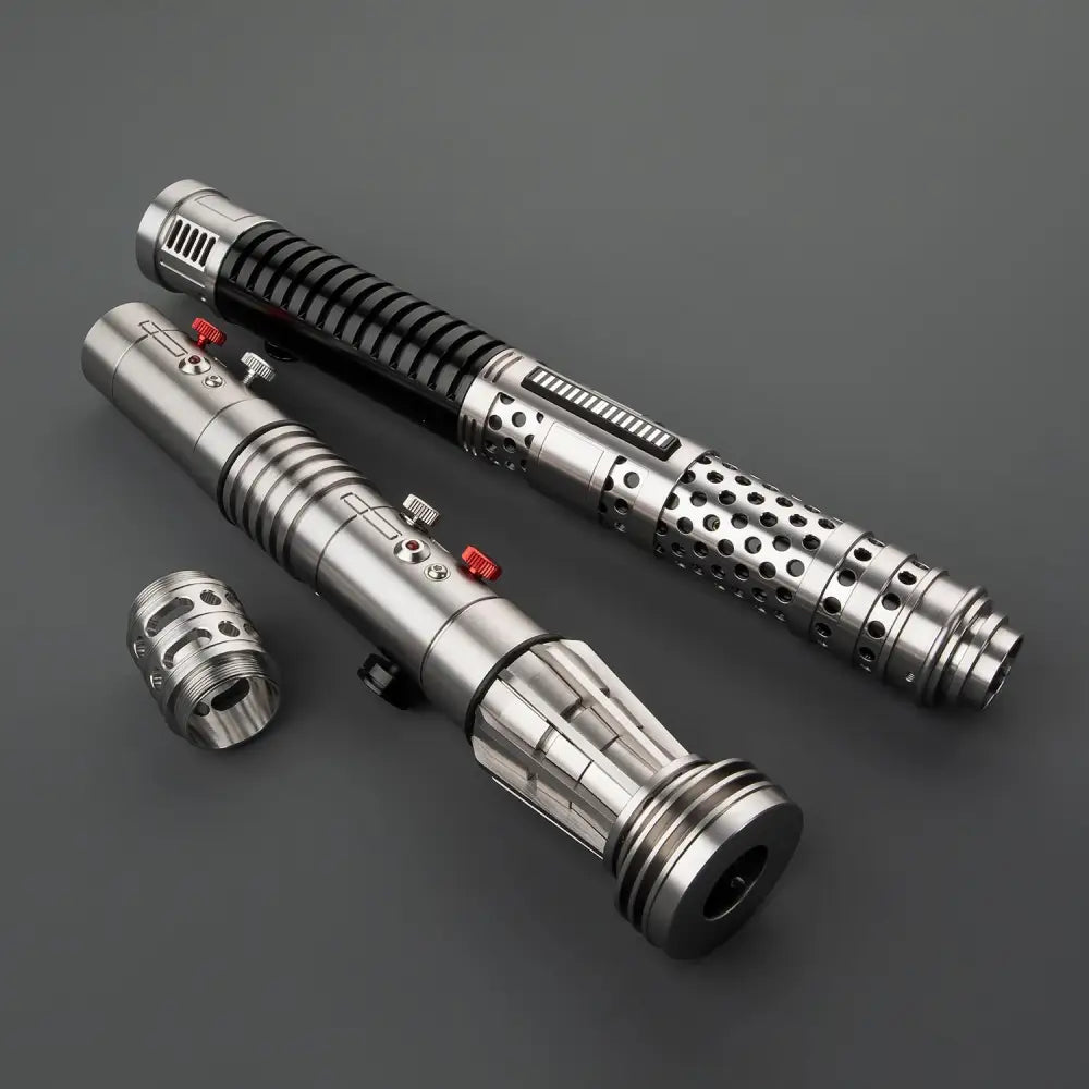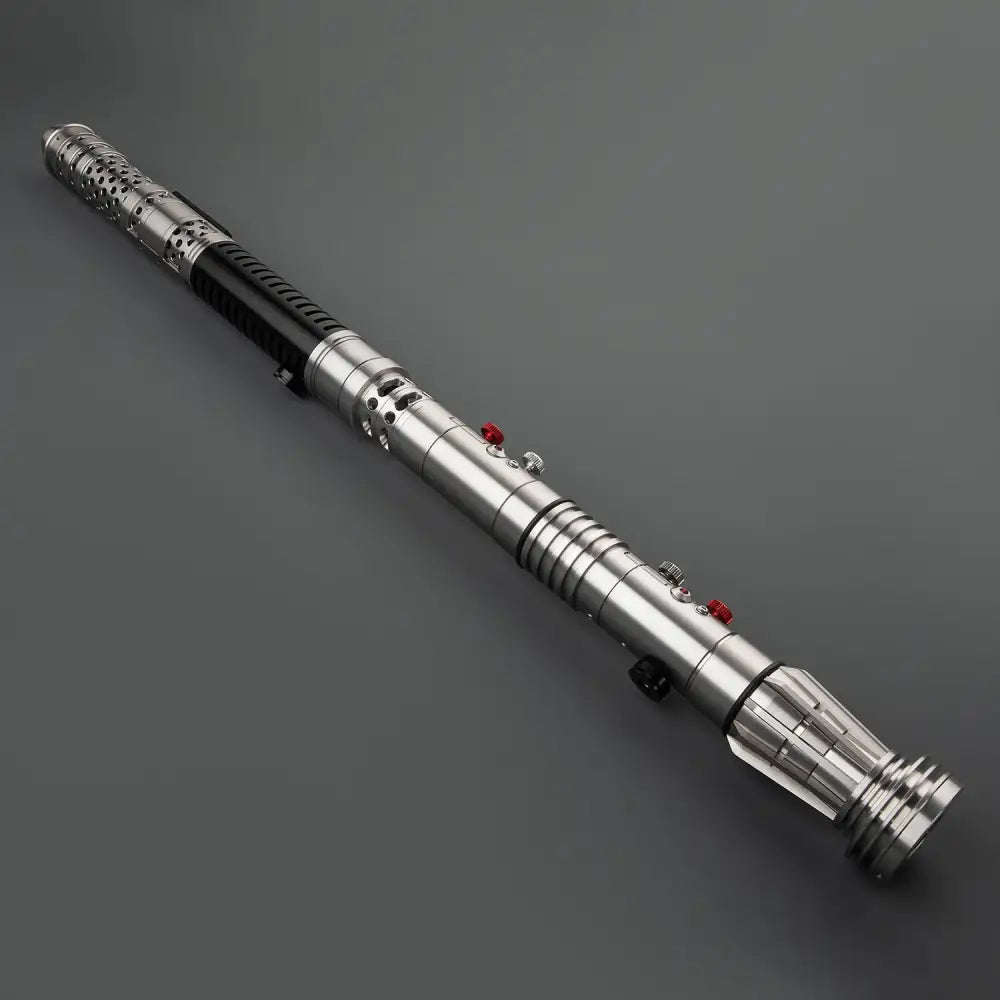 Split in two by a skilled master, this lightsaber embarked on a new and captivating chapter, resurfacing with renewed power from the depths of darkness. The two separate blades, expertly intertwined at the center, create a breathtaking visual and auditory spectacle, a magnetic symphony that enchants both the eyes and the ears. From a mere weapon to a cinematic icon, this lightsaber has been skillfully wielded by two distinct followers of the dark side along its journey. Join this epic tale.