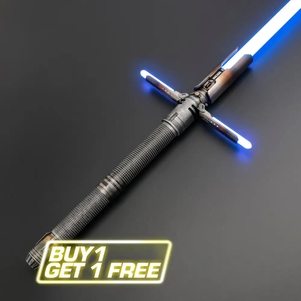 Discover the Cal Cross Guard Saber! This unique lightsaber features an innovative crossguard design with two fixed side blades, enhancing both protection and style. Please note that the side blades are securely attached with glue and cannot be removed.
