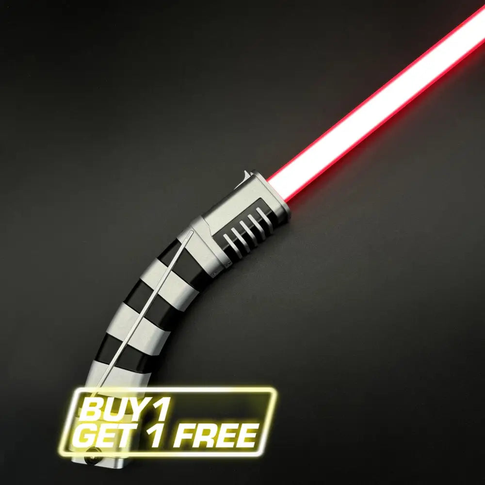 The Serpentine V1 comes in two curved grips, inspired by Ventress, is a weapon that embodies the perfect blend of elegance and danger. The sinuous lines and silver details blend with the dark tones of black, giving the saber a menacing and sophisticated look, just like its mistress. The curved handles allow for versatile and deadly use, perfect for use in acrobatic combat and dancing to the dark side of the Force, as Asajj Ventress taught us in her most famous battles. The red blade, emblematic of her affinity with the Dark Side, reveals a destructive power ready to be unleashed.