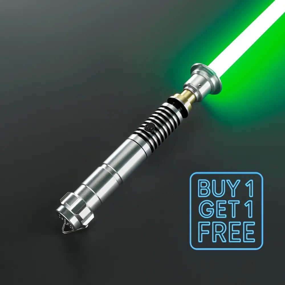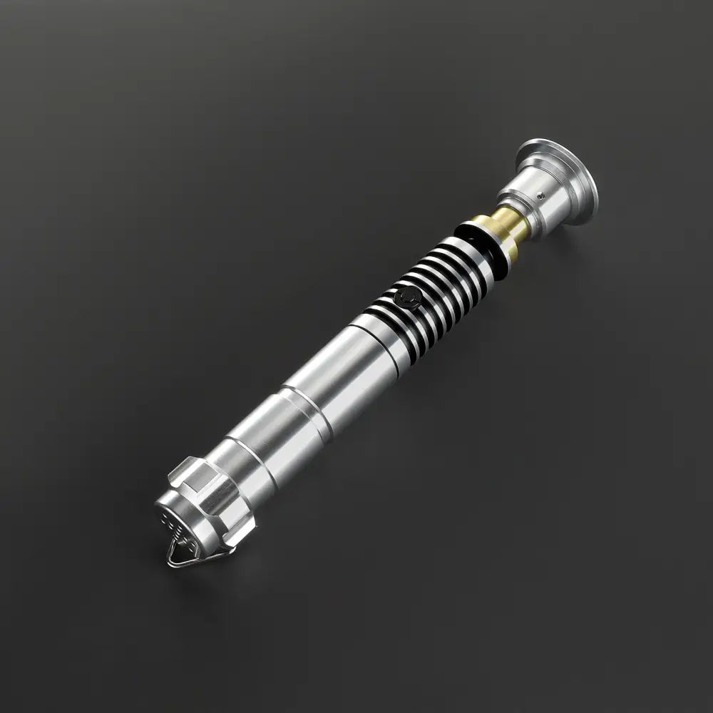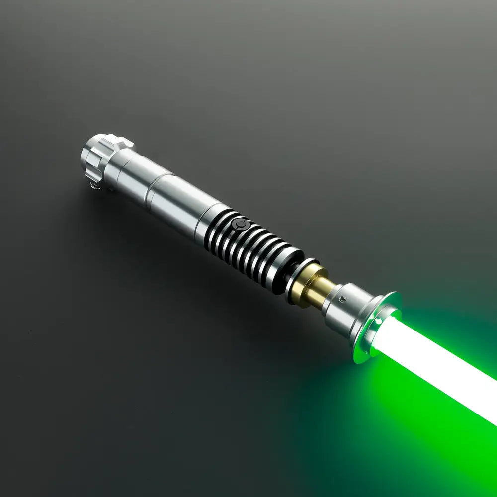The Simple version of the Skyglider retains an understated and elegant design, symbolising Luke's growth from apprentice to mature Jedi. The green blade remains emblematic, representing a new phase in his journey. The cylindrical handle features metal detailing and black sections for improved grip. This version includes a removable frame and pommel with a ring or hook, making it practical to attach to the belt.