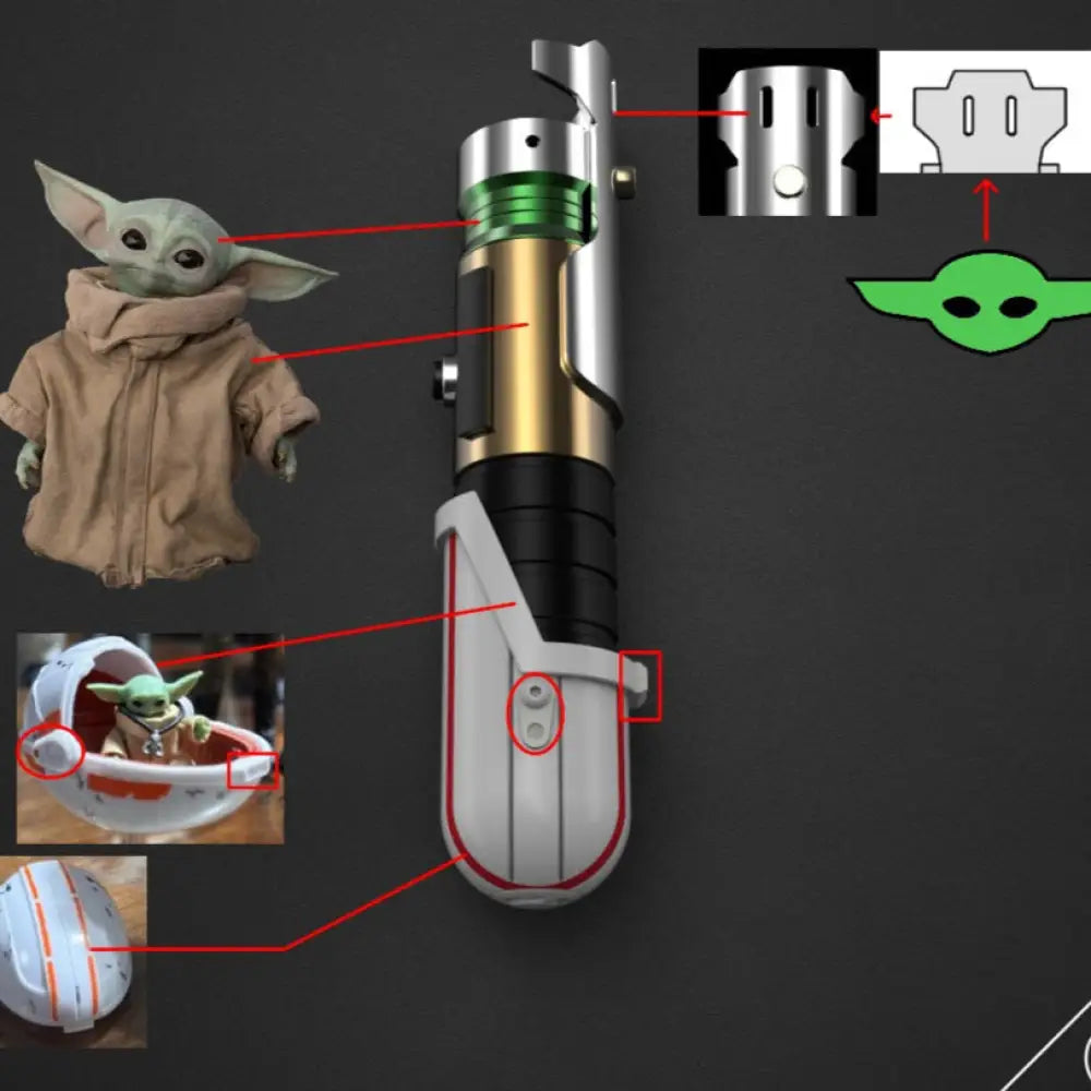 Inspired Design: The hilt combines shades of gold, silver, black, and green, evoking the distinctive colors of little Grogu and his clothing.